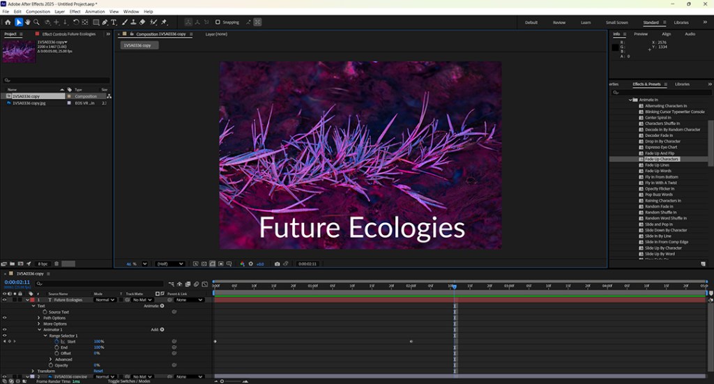 I’ve just completed my first Adobe After Effects online short course with UAL. This feels like a complete gamechanger for my creative practice! I’ve learned about key settings, the timeline, and working with compositions, as well as animating with keyframes and expressions. There’s a fair amount of overlap with programmes like Photoshop and Premiere Pro (which I’m already familiar with) so the learning curve hasn’t been too steep. Having said that, I still feel as though there’s plenty to learn so I’ll be doing a lot of practice in the run-up to my next training course.