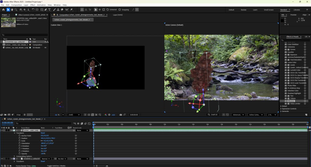 I’ve just finished the second of my Adobe After Effects training courses. This intermediate course covered working in 3D with After Effects cameras and lights, animating with expressions, rotoscoping, chroma keying and track mattes, and much more. It’s exciting to finally understand how to use the 3D tools in After Effects, which means that I can now position and animate 3D models. The potential of using these techniques within my creative practice is huge!