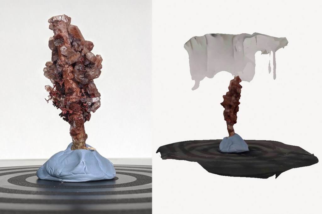 The next photograph includes two images side by side. The image of the left, shows the specimen on a small turntable in my studio while the image on the right shows the 3D model created using Polycam on my mobile phone. The 3D scanning app seemed to struggle with the turntable and it also fused part of the white background to the specimen.
