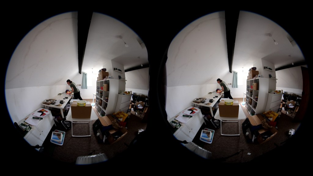 My most significant purchase for this project was a Canon RF 5.2mm F2.8L Dual Fisheye Lens for stereoscopic video production. This is a highly specialised piece of equipment that I was lucky enough to find second hand. After checking, and manually adjusting, the focus difference between left and right lenses I set up the camera in my studio so that I could record my first VR video. Inevitably, there were some issues. The most significant of which, was the tripod legs (and dials on the tripod head) appearing in the 190° field of view. I’m now researching the best possible solution/s to this problem.