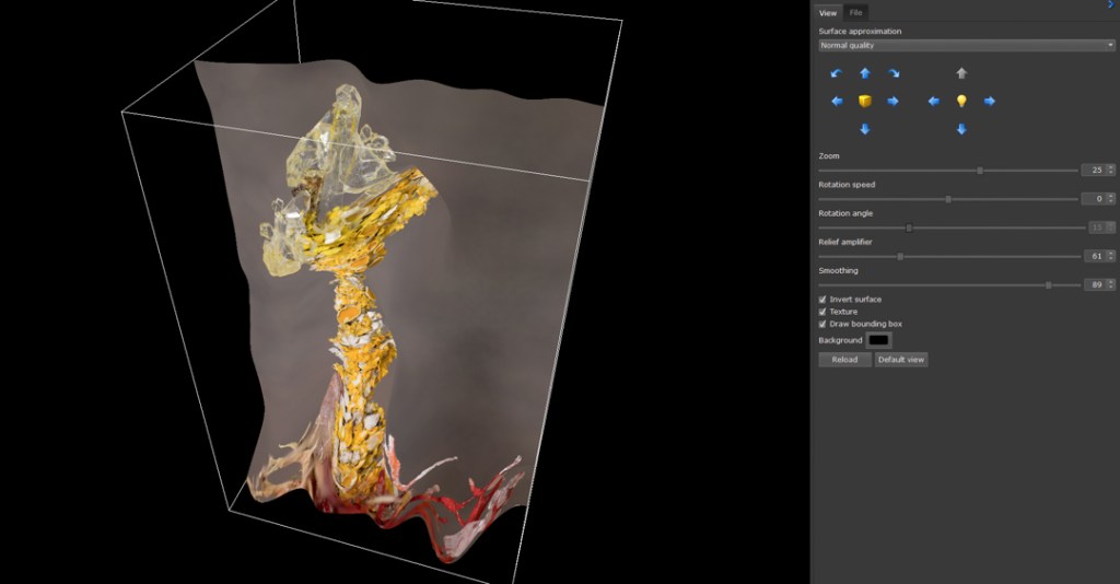 I’ve been experimenting with different ways of creating 3D models of my crystallised lichens. The first method I tried was reconstructing the 3D surface from a depth map – using a recent focus-stacked image – in Helicon Focus. This gave me some very strange results (see yellow specimen below) so I quickly progressed to photogrammetry.