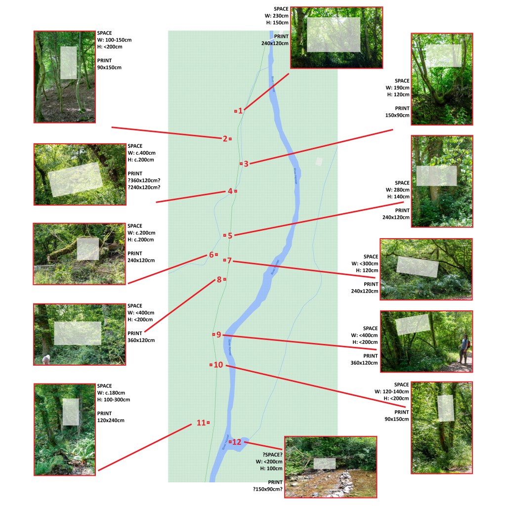 Installation planning! Just two months until Somerset Art Weeks so I’ve been walking along the main trail at Horner Wood looking for likely places to hang my photographic prints. With the help of Somerset Art Works and the National Trust (Holnicote Estate), I’ve identified and measured a few really great spots! Now, I need to start mapping where each image will go…