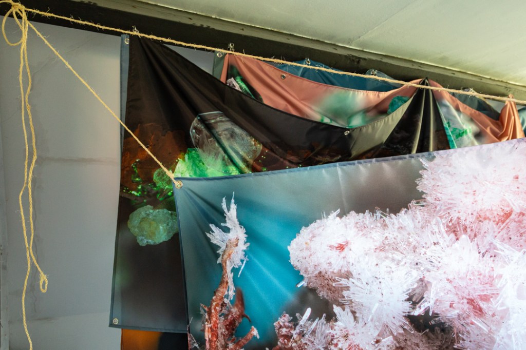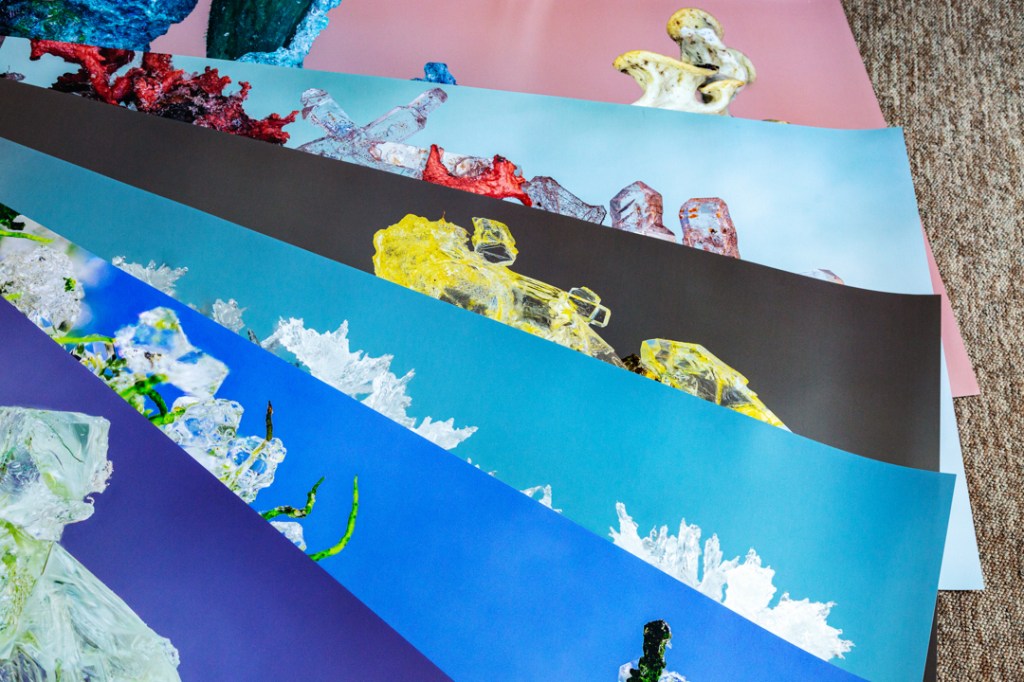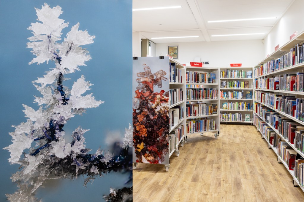 The series Arborea takes windfall lichens from ancient Exmoor woodlands and soaks them in a chemical solution until crystals form. This artistic experiment mimics the prevailing ecological and climatic crises; where human actions are influencing geological processes with unpredictable consequences.